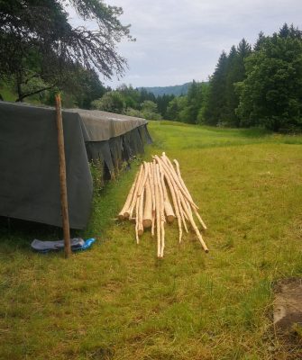 In Vorbereitung auf die Earthlodge 2025 benötigten wir viele Helfer, und glücklicherweise waren zahlreiche Leute bereit zu helfen. Wir haben ein neues, größeres Tipi für die Kinderlodge angeschafft, in dem deutlich mehr Kinder Platz finden. Dafür brauchten wir neue Stangen!